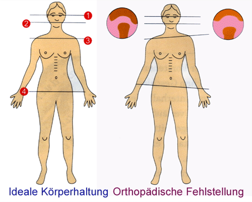 Augenebene 1, Bissebene 2, Schultergürtelebene 3, Hüftebene 4. Orthopädische Fehlstellungen (z.B. kurzes Bein oder Bissstörung) können, unabhängig von ihrem Ursprung, eine Reihe nachfolgender Haltungsänderungen auslösen. Diese erstrecken sich unter Umständen über die gesamte Körperstatik. |
